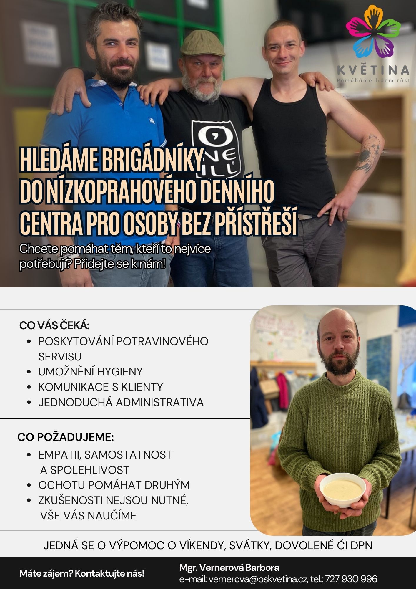 Nabídka brigády: Květina, z. s.: Nízkoprahové denní centrum pro osoby bez přístřeší V příloze nabídka brigády v NDC pro lidi bez přístřeší v Teplicích. Brigády probíhají zejména o víkendech, svátcích. Vhodné pro studenty. DPP-NDCKStáhnout